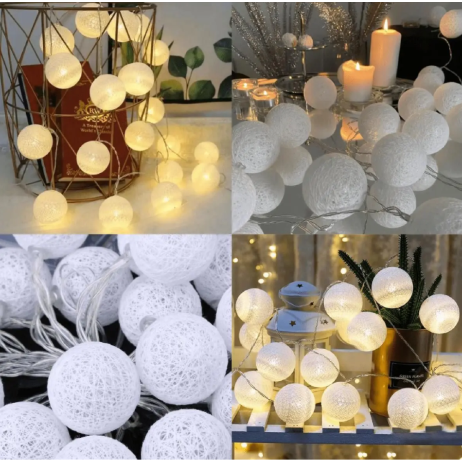 2m 10'lu Işıklı Beyaz Top Dekoratif Süs Pilli