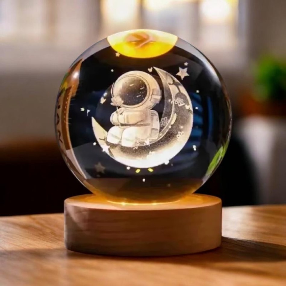 Dekoratif Ay Üstünde Astronot Tasarımlı Ahşap altlıklı Işıklı Cam Küre 6cm